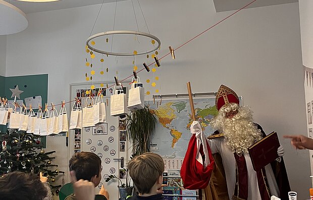 Mit seinem großen roten Mantel Weisen Bart und Zauberstab hat der Nikolaus heute unseren Kindergarten besucht.