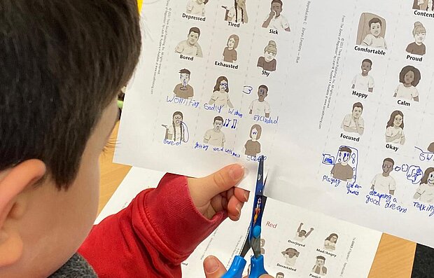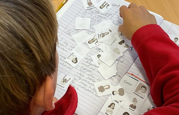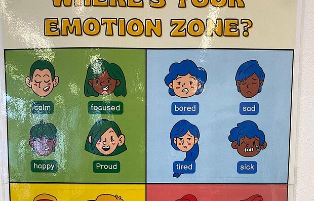 In Frau Evas PYP3-Klasse machen die Schüler die Zonen zu etwas Persönlichem. Sie haben bunte Poster mit Zeichnungen und Symbolen erstellt, die jede Zone darstellen und sie täglich daran erinnern, wie sich Emotionen im Laufe des Tages verändern können. Jeder Schüler hat einen Namensclip, den er von einer Zone in eine andere verschiebt, um seine aktuelle Stimmung oder sein Energieniveau widerzuspiegeln. Dies ist eine wirkungsvolle visuelle und interaktive Methode für die Schüler, ihre Emotionen zu verfolgen und Selbstregulierung zu üben.