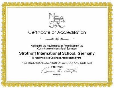 Die New England Association of Schools and Colleges (NEASC) ist eine unabhängige, freiwillige, gemeinnützige Mitgliederorganisation, die mit mehr als 1500 öffentlichen, unabhängigen und internationalen Schulen in den USA und weltweit zusammenarbeitet, um eine qualitativ hochwertige Bildung für alle Schülerinnen und Schüler durch Akkreditierung, professionelle Unterstützung und das Streben nach Best Practices zu bewerten, zu unterstützen und zu fördern. NEASC strebt danach, einen Prozess für eine sinnvolle, kontinuierliche Verbesserung der gesamten Schule bereitzustellen und dabei die einzigartige Kultur und den Kontext jeder von uns unterstützten Einrichtung zu berücksichtigen.