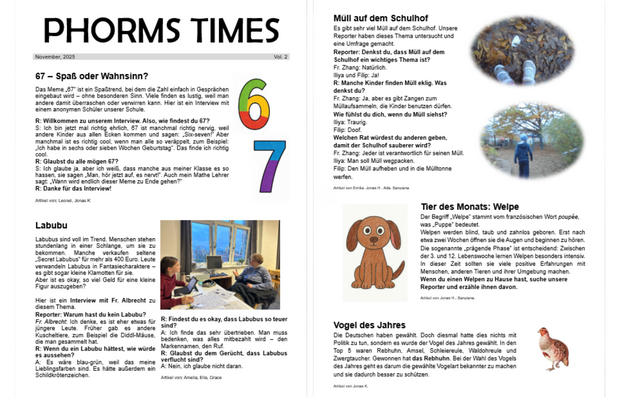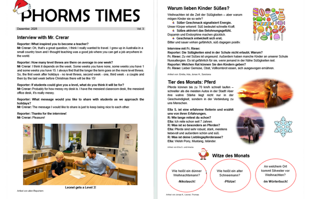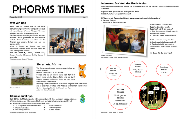 Bisher sind bereits drei Ausgaben erschienen, die bei Schülerinnen und Schülern sowie bei Lehrkräften sehr gut angekommen sind. In der Phorms Times finden sich spannende Berichte über Schulereignisse, aktuelle Themen und Trends aus dem Schulalltag, Interviews mit Schülern und Lehrern, der Witz des Monats und vieles mehr.