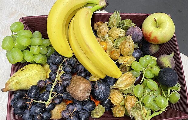 Da die Gesundheit unserer Lehrkräfte uns sehr am Herzen liegt, kommen passend zur grauen Jahreszeit bunte Obstkörbe in die Lehrerzimmer. Feigen, Physalis, Äpfel und Trauben sind süß, lecker und voller Vitamin C.